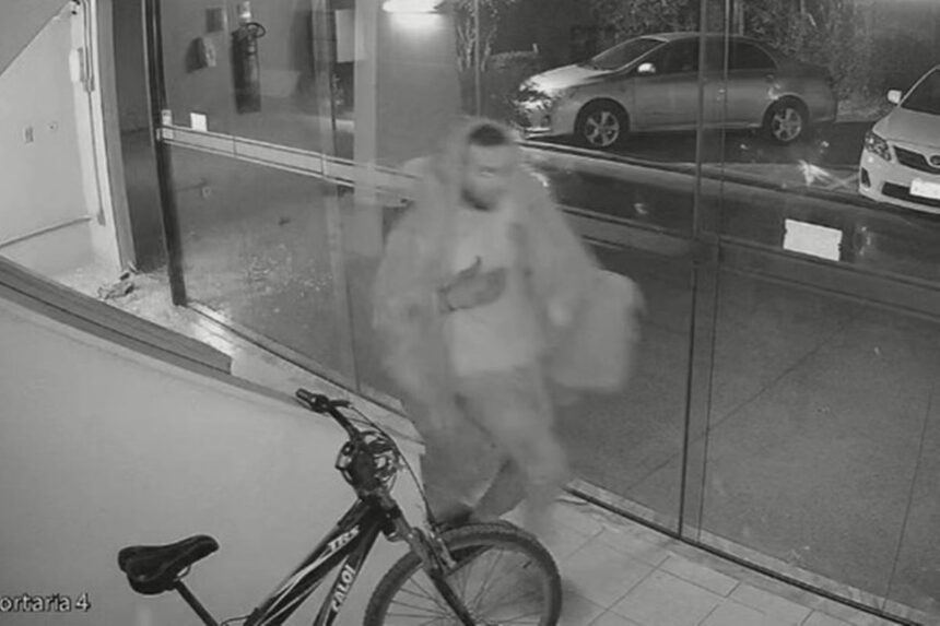 O crime foi cometido pouco antes das 3h desta terça-feira (12/8). Coberto com um cobertor, o ladrão se aproxima da portaria e arremessa o que parece ser um pedaço de concreto em um dos cantos da vidraça.